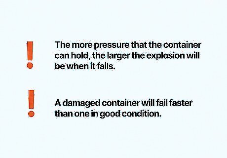 Think about the effect of the container. In the case of mechanical explosion, the strength of the container will play a significant role in the strength of the explosion. Typically, the more pressure that the container can hold, the larger the explosion will be when it fails. Also, the condition of the container will affect how easily it will fail. A damaged container will fail faster than one in good condition. Other properties of the container can change how quickly the pressure will build in a given situation. For example, a container that conducts heat readily will allow a fluid to expand faster than one that insulates the fluid. Keeping with the example of a blown tire, a worn out tire is much more likely to have a blowout than a new tire.