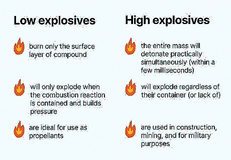 Differentiate between high and low explosives. High and low refer to the velocity of the combustion. Low explosives burn only the surface layer of compound, though they burn very quickly (fireworks and gunpowder are low explosives). When dealing with compounds classified as high explosives, the entire mass will detonate practically simultaneously (within a few milliseconds). Low explosives are ideal for use as propellants, while high explosives are used in construction, mining, and for military purposes. There may be other uses for either type of explosive. Another differentiation between high and low explosives is the need for pressure. Low explosives will only explode when the combustion reaction is contained and builds pressure. High explosives will explode regardless of their container (or lack of).