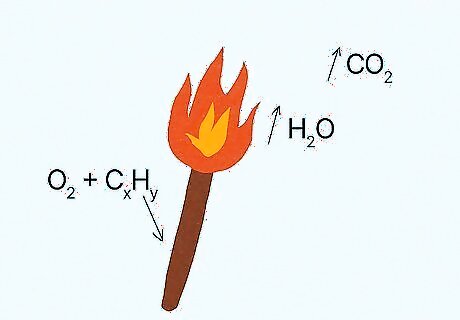 Learn about the process of combustion. Combustion is a chemical process by which hydrocarbons and oxygen react to release energy and form carbon dioxide (CO2) and water (H2O). This is commonly known as “burning.” For example, when you light a piece of wood on fire, the hydrocarbon chains in the wood are reacting with oxygen (or oxidizing) at a rapid rate. The reaction is exothermic (gives off energy), and energy is released in the form of heat and light (the flame). This process is the same process that low explosives undergo to detonate. For example, think about what happens when you ignite gunpowder. The spark provides the energy needed to start the reaction, and then the carbon is oxidized. The rapid formation of gas (CO2 and H2O) propels the bullet from the gun.