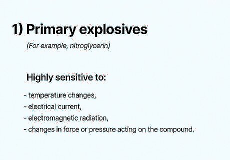 Identify primary explosives. Primary explosives are broadly defined as explosives that will detonate without an explosion to start the reaction. This basically means that primary explosives are the most easily detonated class. This class of explosives is highly sensitive to temperature changes, electrical current, electromagnetic radiation, or changes in force or pressure acting on the compound. They are used for making things like fireworks and blasting caps. For example, nitroglycerin can be set off just by shaking or dropping a bottle of it. This makes it very dangerous to handle. Blasting caps are explosive devices that are utilized to set off another explosive device.
