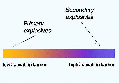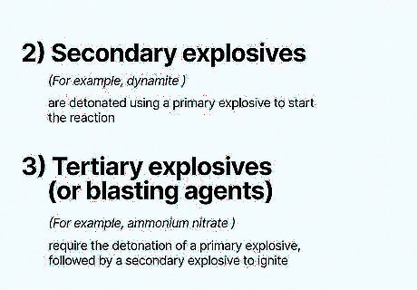 Understand secondary explosives. Secondary explosives consist of compounds that are much more stable than primary explosives. This means they need a lot of energy to be initiated will not be ignited easily if jarred, heated, or shocked. Instead, secondary explosives are detonated using a primary explosive (e.g., a blasting cap) to start the reaction. Dynamite is an example of a secondary explosive. Another tier of explosives, tertiary explosives (or blasting agents), require the detonation of a primary explosive, followed by a secondary explosive to ignite. These are typically used in industries like mining and have the benefit of being very stable and safe to transport (e.g., ammonium nitrate/fuel oil mixture, ANFO).