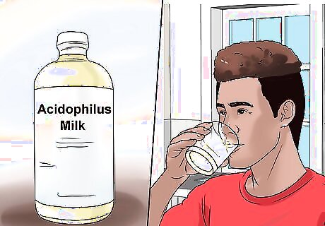 Drink acidophilus milk. In order to get more acidophilus, consider drinking acidophilus milk. It is available through health food stores and some grocery stores. The milk has a tangy taste and a slightly thicker consistency than cow's milk. Unlike the advertised CFU strength in tablets, capsules, and powders, the amount of the supplement in the milk usually isn't verified. This makes it difficult to know how much acidophilus you are drinking.