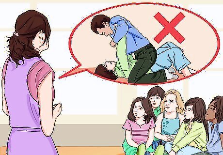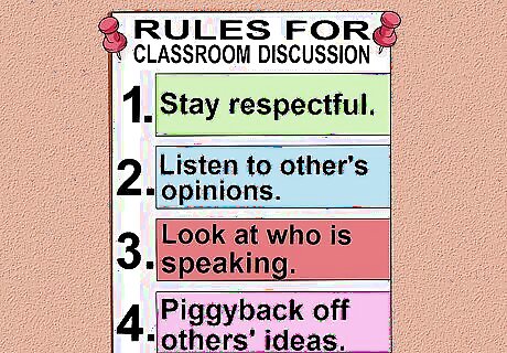 Post rules for classroom discussion. Younger students will need some guidance on respectful discussion. Have the class make the rules together, using examples like “Stay respectful,” “Listen to others’ opinions,” “Look at who is speaking,” and “Piggyback off others’ ideas.” Post the rules in a visible place in the room and remind students of the rules before starting a discussion.