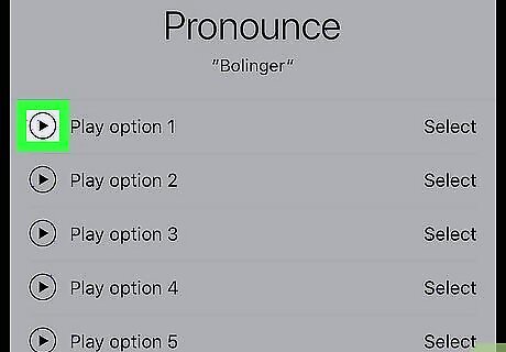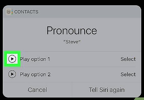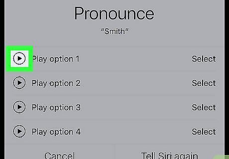 Tap the play icon Android 7 Play next to the pronunciations. Siri will give you a list of two to five pronunciations. Siri will say each pronunciation when you tap the play triangle next to each pronunciation.