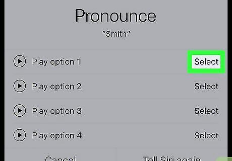 Tap Select next to the correct pronunciation. This is the pronunciation Siri will use for your first name from now on. If none of the pronunciations are correct, you can tap Tell Siri again at the bottom of the pop-up and repeat the pronunciation.