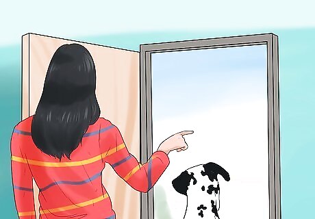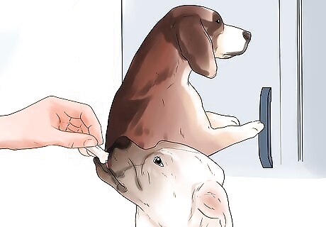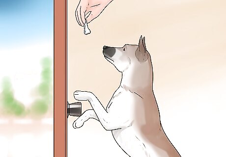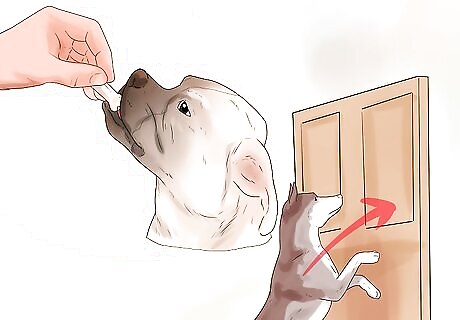 Teach your dog to move to the correct side of the door. This can be difficult because he is not doing anything specific. Try putting a treat between your fingers. Then put the treat in front of their face. Without releasing the treat, move your hand toward the spot you want your dog to be (i.e., behind the door). When your dog gets behind the door, release the treat. If you already have a command for your dog to sit on a specific spot or on or near an item or blanket, use that to get your dog to move behind the door. Place the item he sits close to or on behind the door, and use the proper command.