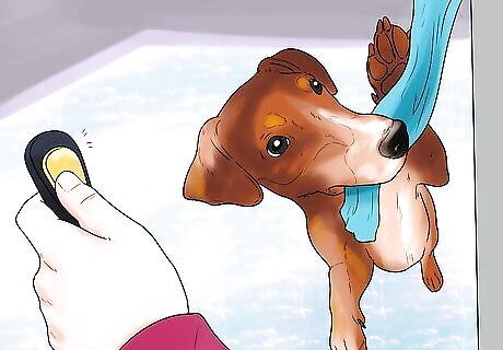 Train your dog to pull on the towel or rope. Once your dog knows to bite the towel or rope you are close to the finish line. Stop providing clicks and rewards for simply biting the rope. Make him hold or pull on the rope next. Taper your clicks and rewards so that he must pull harder and harder to get rewarded.