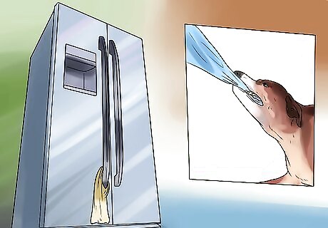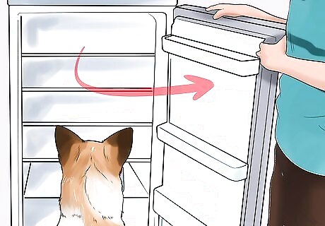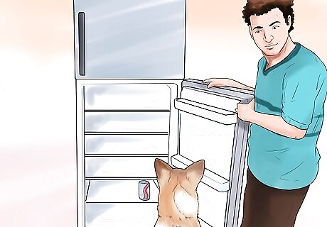 Make the fridge easy to open for your dog. Although your dog will likely get into anything you leave out, you probably take for granted the fact he can't get into the refrigerator. To make it easier for him, hang something from the handle of the refrigerator door. A rope with a thick knot on the end works particularly well for this, but a towel will work too. Just make sure it is properly secured to the handle. If you decide to use an old rope or towel (i.e., something you don't mind ruining), check the integrity of the threads. If strands come off or it rips with little effort, find something newer. The fibers and dust will distract your dog and may be harmful to his health.