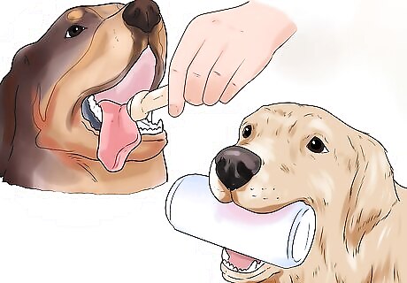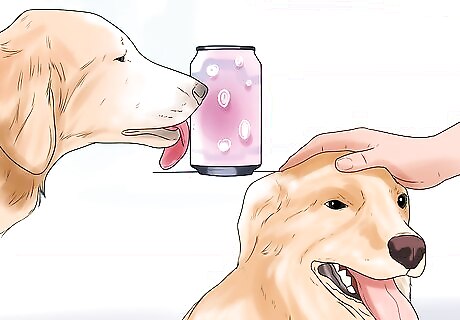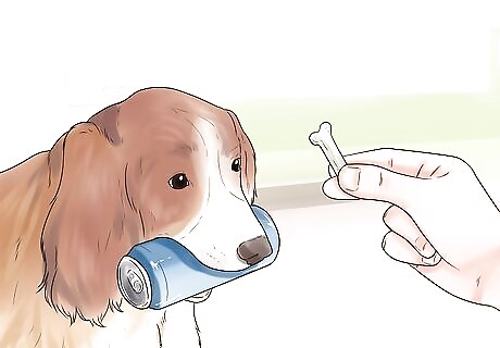 Praise your dog for trying to bite the can. As your dog investigates the can, he may engage in a number of behaviors. Any behavior that is closer to biting and picking up the can should receive a click and a reward. He may first sniff. Then he may lick. Then he may try to bite the can to carry it to another spot for more comfortable licking. Your dog may start licking the can profusely. It is cold, and licking the can will provide a very novel experience for him. If he starts doing nothing but lick the can, stop rewarding him for licking the can. If it takes a while to get your dog to bite the can, replace the can with a cold one from the refrigerator. This way he is biting and picking up a cold can instead of a lukewarm one. If you have a "pick it up" command typically used with a ball, use that command to teach the dog to pick up the beer can.