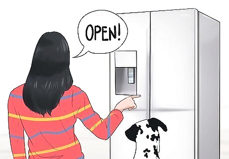 Open the refrigerator door. Now it’s time to move to the last subtask. Just as you taught your dog to close a door, you now need to teach him to close the refrigerator door. This time you will want to change the verbal command. Instead of "close the door", try "close the fridge". This way he knows exactly which door to close even if you are in another room.
