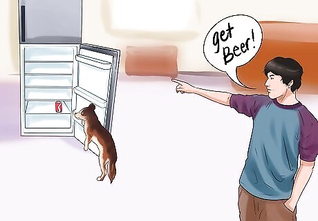 Practice doing all three in sequence. While standing near the refrigerator, give your dog each command in sequence. First "Open the fridge", then "Bring me a beer", then "Close the fridge". At first, reward him for each task completed. Then start rewarding him only when he finishes the last task. Keep giving the commands as you move into a different room.