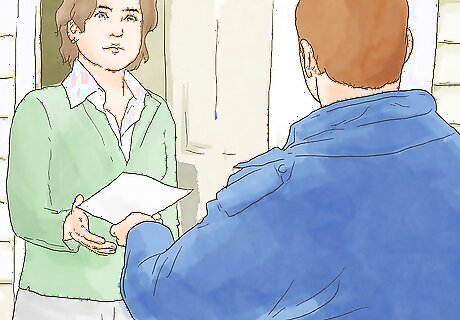 Serve notice on the tenant. You have to give the tenant notice of the eviction lawsuit. Unfortunately, you typically can’t just hand-deliver it to the tenant yourself. Instead, your court will have specific rules for delivering service. You should ask the court clerk for acceptable methods of service. Typically, you will need someone to hand-deliver the notice to the tenant. You can often pay the sheriff to make personal service on the tenant, or you can hire a private process server. You can find process servers in the phone book or on the Internet. They typically charge $45-75 per service. You might also be able to have anyone 18 or older who is not a part of the lawsuit hand-deliver the notice. In some courts, you can mail the complaint to the tenant.