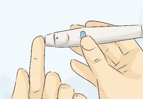 Prick your finger with the lancet. Take the cap off the lancet and place the tip of it up against the spot that you just sterilized. Press down on the lancet towards your finger until it clicks, which will stick your finger. The lancet is small, so it won’t hurt your finger too much.