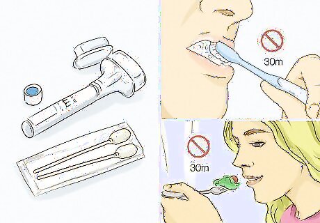 Avoid eating or brushing your teeth 30 minutes before collecting a sample. Toothpaste and food can all interfere with the results of the test. You can drink water, but try not to put anything else in your mouth before you take your sample. If your mouth bleeds from flossing, it can also skew the results.