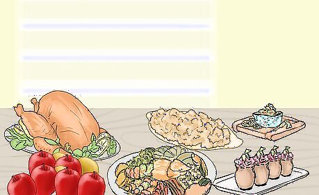 Make your party a potluck. Think about turning your Christmas party into a potluck where everyone brings a dish. This will not only save you a lot of money, but you'll get people invested in the party itself. Coordinate what your guests are bringing. You can either start a list that people can access on the internet, assign people dishes, or make a list of suggested foods and allow people to pick what they want to bring. Some items to suggest include: pumpkin pie, Christmas bean salad, Christmas cake, cranberry sauce, mashed potatoes, snickerdoodles, dinner rolls, and Swedish meatballs. Supply items that others did not provide. In the end, you might find your guests did not supply all of the essentials – like dip to go with chips. Make sure to communicate with your guests about any dietary restrictions. Try to offer at least one vegan/vegetarian option so that everyone can participate in the festivities.