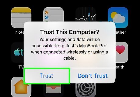 Connect your iPhone and Mac with a USB cable. You'll most likely need the cable that came with your phone, as the side that connects with the phone is a lightning port and the other end is a USB. Tap Trust this computer on your phone if prompted. You'll need to tap this to allow the data to be transferred between your iPhone and Mac.