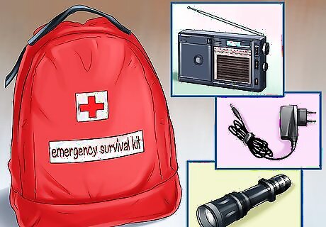 Create a hurricane preparedness kit. If you can't avoid the hurricane and are caught in it, it's important that you are prepared and have clean water, food, and first aid supplies ready. If you get stuck in the middle of a hurricane, you may not be able to leave your lodging until it passes. Pack essential things like prescription medicine and clothing as well. Other things that can go in your hurricane preparedness kit include wireless cell-phone chargers, a battery-powered radio, flashlight, and can opener. You should also bring things like filtration bottles, energy bars, and batteries.