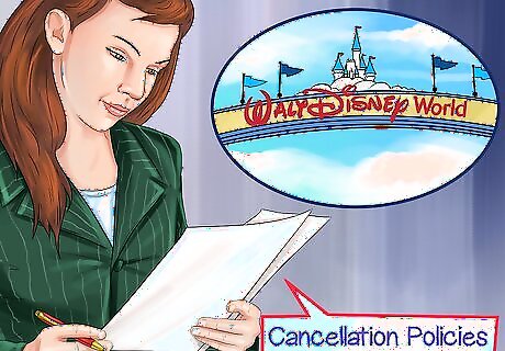 Read up on the cancellation policies for your lodging and activities. Look up the cancellation policies so that you don't lose deposits for things to do at your destination. Don't purchase tickets to things that don't have a refund policy in case of a hurricane or you may lose your money. Places like Disney World allow travelers to cancel their hotel and activity reservations a week in advance with no added fees in the case of a hurricane. Villas and hotels on the Cayman Islands offer a worry-free hurricane guarantee that will reimburse travelers in case of hurricane cancellations.