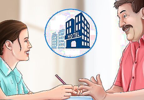Communicate with hotel staff. Get the emergency policies from the staff, so you know the correct procedures during a hurricane. Understanding the procedures in the case of an emergency can keep you safe, and the staff most likely already has a procedure to evacuate guests to safe areas. Talk to the front desk before the hurricane hits so that you have an understanding for the safety and evacuation plan. If there is an evacuation plan to somewhere safe, follow hotel staff as soon as possible.