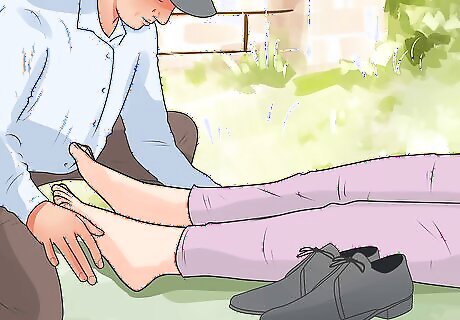 Call for an ambulance if the patient is in extreme pain, or if the foot exhibits any major symptoms. Some major symptoms are misshapenness, deformity, large cuts or wounds, and severe discoloration of the foot. While the ambulance is on its way, encourage the patient to keep still and stay calm. Keep the patient lying down, with the injured foot elevated higher than the heart.