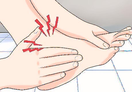 Remove the shoes and socks of both feet and check for common symptoms of a broken foot. Compare both feet side by side to check for swelling or any other differences in appearance. The most common symptoms are immediate pain, swelling, and deformity. Other symptoms include: Bruising or tenderness of the foot. Numbness, coldness, or bruising. Large wounds or exposed bones. Increased pain when active, and decreased pain with rest. Difficulty walking or bearing weight.