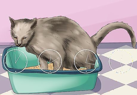 Take note if your cat is visiting its litter box more than usual. A cat with bacterial cystitis will likely try to urinate more often during the day because it produces only a small amount of urine each time. Pay attention to how often your cat visits its litter box and how long each visit lasts. A cat that is straining to urinate will usually spend more time in its litter box than a healthy cat would. As a general rule, a cat should not spend more than 2-3 minutes in its litter box per visit. Watch your cat in the litter box. If the cat appears to be straining to urinate or if the cat doesn't urinate after several minutes, there may be a severe issue, such as a blocked bladder. In this case, take your cat to the vet immediately.