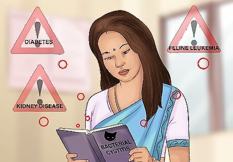 Learn the risk factors for bacterial cystitis. Certain medical conditions may leave your cat at a higher risk for developing bacterial cystitis. Monitor your cat closely if it has, or has had, bladder stones, polyps, or tumors, which can harbour bacteria and irritate the bladder. You cat may also be at a higher risk if it has a medical condition like: Diabetes Feline leukemia Chronic kidney disease