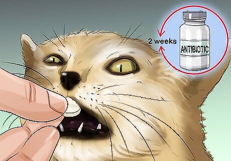 Administer the antibiotics to your cat for 2 weeks. After its initial diagnosis, simple bacterial cystitis is generally treated with antibiotics over the course of 14 days. Give your cat the drug exactly as instructed by your vet, at the same time each day. If you are unsure about how to administer the drug, ask your vet if they can demonstrate how to give the medication to your cat. Amoxicillin, cefadroxil, and cefovecin are some of the antibiotics used to treat bacterial cystitis in cats. Antibiotics are typically prescribed in pill form.
