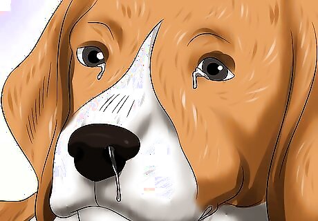 Watch for discharge. Once these other symptoms show up, your dog may begin to see other symptoms. Some dogs develop a clear, runny discharge from the nose and eyes. In some cases, the discharge may be accompanied by a cloudy appearance over one or both eyes. This condition is known as blue eye because it causes the eyes to develop a bluish color.