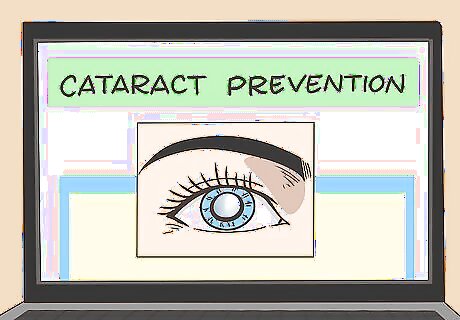 Protect your eyes from UV-light. Ultraviolet light from the sun can promote the development and progression of cataracts. Wearing some form of protection from the sun can help to minimize your risk of getting cataracts. Wear sunglasses that specifically block out UVB rays. Consider getting a pair of prescription sunglasses to most effectively protect your eyes. If you do not like wearing sunglasses, put on a hat with a large brim, which can help protect your eyes from UV rays.