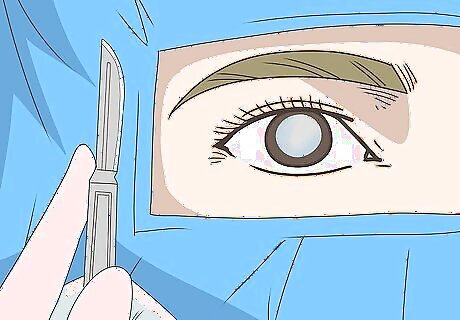 Remove cataracts with surgery. Your cataracts will likely get to a point where your vision is affected significantly enough to require surgery. Speak to your doctor and schedule an appointment to have your cataracts removed surgically. Consider surgery once cataracts begin to interfere with your everyday activities. Cataract surgery removes your clouded lens and replaces it with a new, clear lens. In some cases, your doctor cannot replace the lens because of other eye problems or medical issues. Your doctor can still remove the cataract and prescribe corrective lenses to help you see without a new lens implant. Cataract surgery is safe in most cases. It can cause infection or bleeding. Cataract surgery is usually done on an outpatient basis and won’t require a hospital stay. It is the most frequently performed surgery in the U.S. each year. If you have cataracts in both eyes, your doctor will schedule two separate surgeries to help ensure that you have vision in at least one eye.