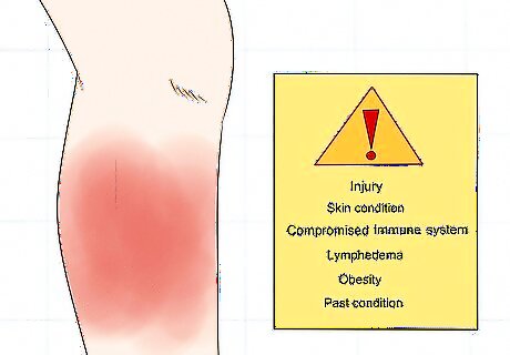 Be aware of the risk factors. Cellulitis is a skin infection that usually occurs on the lower legs or shins. It is caused by the spread of a bacterial infection, usually streptococcus or staphylococcus. There are several risk factors that make it more likely for these bacteria to find an entry point into your skin. An injury in the affected area. A cut, burn, or scrape breaks the skin and provides a way in for bacteria. A skin condition like eczema, chicken pox, shingles, or patches of very dry skin. Since the outer layer of skin isn't intact, bacteria are more likely to enter the skin. A compromised immune system. If you have HIV/AIDS, diabetes, kidney disease, or another condition that affects your immune system, you're more susceptible to getting a skin infection. Lymphedema, a chronic swelling of the legs or arms. It can cause the skin to crack, leading to infection. Obesity has been connected to an elevated risk of getting cellulitis. If you have had cellulitis in the past, you are prone to develop it again.