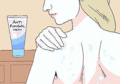 Add an over-the-counter antifungal cream. Antifungal creams with clotrimazole, such as Lotrimin, gradually kill the fungus that causes your fungal acne. Read the instructions on the box carefully before applying the cream. Generally, you should see results if you apply the cream twice a day for a couple of weeks. You can buy antifungal creams online or in your local pharmacy or supermarket. Since these creams are primarily marketed for treatment of athlete's foot, you'll likely find them with foot care products. Wash and dry the affected area with mild soap and warm water before applying antifungal cream with clotrimazole. Wash your hands both before and after applying it.