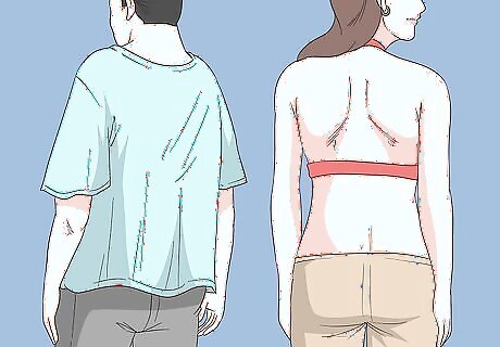 Wear looser clothes that don't rub against your skin. Tight-fitting clothes that rub against your skin trap heat and sweat, which can encourage fungal acne to spread. Wear light, breathable layers, especially when in you're going to be active or in a hot and humid environment. If you have a dress code that requires a top that irritates the fungal acne on your back, try wearing a soft t-shirt underneath to help protect it. If you anticipate that you're going to get sweaty and won't have the opportunity to shower, bring a clean, dry shirt that you can change into. If you wear a bra and the straps rub against the inflamed area, try going without a bra or look for a bra in a different style that won't irritate your skin as much — at least until the fungal acne has cleared.