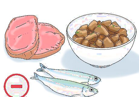 Limit your consumption of red meat, seafood, and organ meat. These dishes are high in purine, which raises your uric acid levels. Since high levels of uric acid in your blood causes gout, a diet high in these types of foods can worsen your symptoms. Cut out beef, pork, lamb, sardines, anchovies, kidney, liver, and sweetbreads. Instead, get your protein from poultry, low-fat dairy, beans, and lentils. Include more vegetables in your diet rather than red meats.Tip: If you really enjoy seafood, there are a few options that are low in purine, such as salmon, mahi mahi, snapper, and tilapia. These fish shouldn’t raise your uric acid levels.
