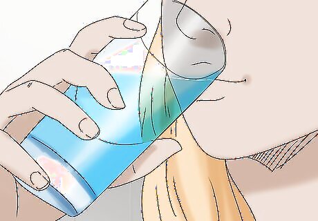 Drink a lot of water to hydrate your body. Dehydration can make your gout worse. Additionally, drinking lots of water can help flush out the uric acid in your body, which can help relieve your gout. Make sure you’re drinking at least 8 cups (1.9 L) of water each day, but it’s best to drink more. If you don’t like the taste of water, try flavoring it with cut up fruit, such as lemon or orange slices. You can also drink tea or other unsweetened drinks.