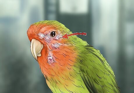 Identify the symptoms of lovebird pox. There are two different types of lovebird pox and they cause two different types of pox. Dry lovebird pox affect the exterior of the bird's body and wet lovebird pox affects the inside of the lovebird's body. Dry avian pox causes wart-like scaly growths on the featherless areas of the surface of a bird's body. They can show up around the eyes, the beak, or on the legs and feet. Avian pox that appear on the eyes can be mistaken for conjunctivitis. "Growths" on the actual eyes are usually avian pox. Wet avian pox causes lesions in the mucus membranes of the bird, specifically in the oral and nasal cavities of the lovebird. These lesions are harder to spot than the dry version but they can be even more serious, as they can interfere with the breathing and eating of the bird.