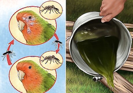 Eliminate mosquito breeding grounds. Lovebird pox can be spread by mosquitoes. If your bird can come into contact with mosquitoes, whether it spends time outdoors or you allow fresh air in your house, then you need to minimize mosquitoes in the area. Get rid of standing water near your home. These can become mosquito breeding grounds. Transmission via mosquitoes occurs when a mosquito bites a bird with lesions and then bites another bird.