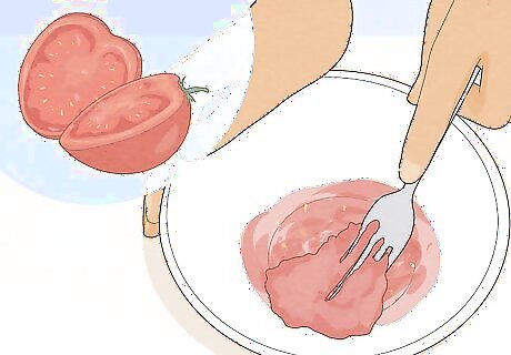 Crush one whole tomato. Using a kitchen knife and stable cutting board, slice the tomato into quarters. Then, place the quartered tomato in a bowl and crush it with a pestle or other kitchen tool.