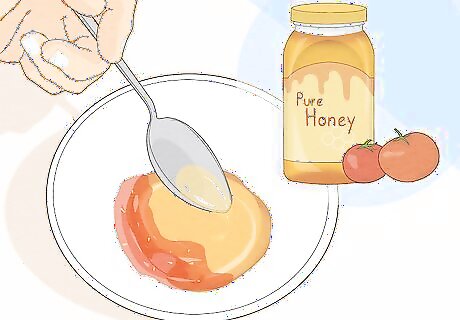 Add honey. To make the tomato mask thicker, stir some honey in with the tomato juice in a bowl and apply this mixture to your face. Honey is a natural moisturizer with anti-bacterial properties, which are needed to eliminate the bacteria that causes acne. Honey is not only great for your skin, it helps hold the tomato mask in place without dripping and making a mess of your house. Tomato face masks, in addition to eliminating excess oil, are particularly effective in combating acne and lightening dark patches of skin.