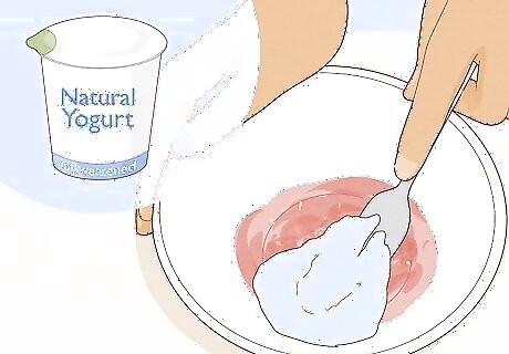 Add yogurt. Mix two tablespoons of yogurt in with the crushed tomato. Blend the two ingredients together until they are evenly mixed. Make sure to use plain yogurt to avoid unwanted additives and chemicals from seeping into your pores. You can use a whisk, spoon or other utensil to blend the tomato and yogurt.