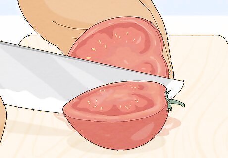 Cut a tomato in half. With a sharp knife, slice the tomato in half on a stable surface, preferably a wooden cutting board. Be careful not to cut yourself. Always cut with the blade of the knife facing away from your hands and body.