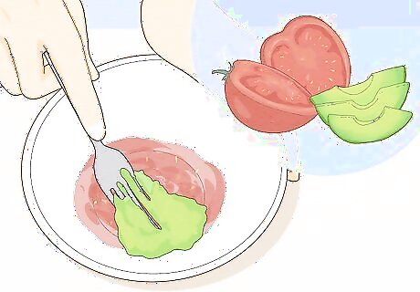 Mash one tomato with one avocado. Slice the tomato into quarters and the avocado into two halves. Using a spoon, scoop the pulp out of the avocado and discard the skin and pit. Crush the tomato quarters up with a mortar and pestle or other kitchen device, and blend the mashed tomato with the avocado pulp. There is no need to wash your face prior to using this treatment. The tomato and avocado mixture is designed to clean your pores out.