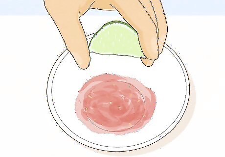 Mix lime and tomato. Combine a tablespoon of tomato juice with 2-4 drops of fresh lime juice. Whisk the two ingredients together until they are well blended. Make sure to use fresh lime and not lime concentrate to ensure the efficacy of the treatment. Again, it is wise to wash your face before using this treatment. Alternatively, you can lemon instead of lime. As they are both citrus fruits, they contain the same beneficial skin treatment agents. Don't mix in extra lime or lemon juice. Too much citrus acid on your skin for long periods of time can actually cause burns.