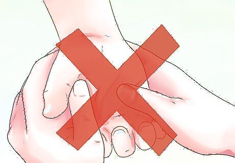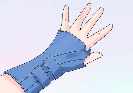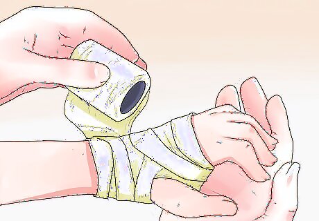 Apply a compression bandage to a sprained wrist. Compression will help to reduce swelling in the area. However, you need to make sure you wrap the elastic bandage so it is not too tight, as this will impede proper blood circulation. To treat a sprained wrist, wrap an Ace bandage around your child’s forearm. Take the tip of the Ace bandage and start wrapping from the base of their fingers all the way up to their forearm, stopping near the elbow. Overlap the elastic bandage about one-half of the width of the first applied wrap. Check the circulation of the wrapped area. If your child’s fingers look blue or they complain about numbness or tightness, restart the process until the wrap feels snug rather than too tight.