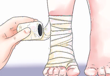 Apply a compression bandage to a sprained ankle. To treat a sprained ankle, start wrapping at the base of your child’s toe. This will help fluids from their toes to move back to their heart and reduce the amount of swelling in the area. Get a good base wrap at the toe so that the elastic bandage will not unravel. After you covered the front and back parts of their foot, continue the wrap at top of their ankle and do a figure 8 wrap. Their heel and toes should be exposed. Secure the wrap with a metal clasp. Check your child’s toes for circulation. Re-wrap the area if their toes look blue or if they complain the wrap feels too tight.