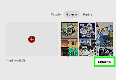 Click Unfollow beneath a board. Doing so will unfollow the board without asking for confirmation. You'll be able to click Follow under the board to re-follow it if you unfollow a board by mistake.