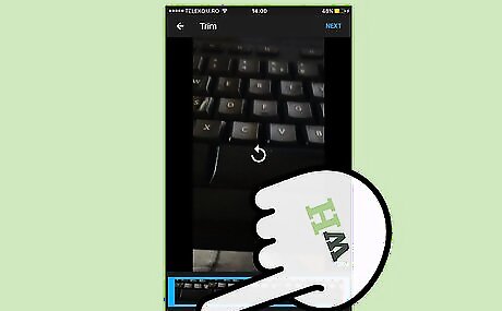 Tap the “scissors” icon to adjust the length. This button in the bottom toolbar (on the left) of the editor and will bring up a video reel. Tap and drag either end to adjust the length of the clip.