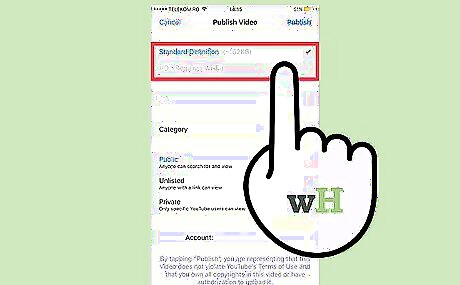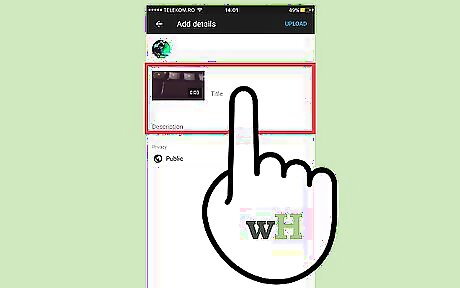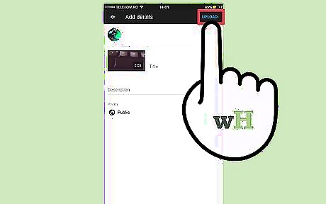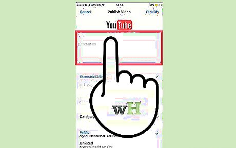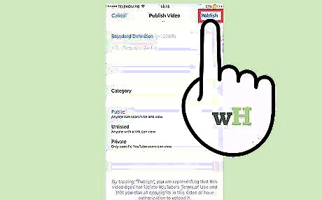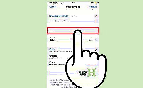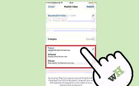 Choose your privacy settings. Tap the settings (default “Public”) to choose between setting you video as Public, Unlisted,or Private. Public videos can be searched for and viewed by anyone, unlisted will not appear in search results but anyone with the link can view it, and private videos can be viewed only by you.