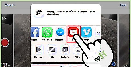 Tap the “Share” button. This button (represented by a square with an up arrow) is in the upper right of the screen and will bring up a list of sharing options. You can also upload previously recorded videos by opening the Photos app, selecting the video from the library, and tapping the “Share” button.